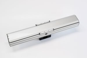 Der Führungskörper besteht aus einem Aluminium Rechteckprofil, in dem zwei Schienenführungen integriert sind. Der daran, auf vier Laufwagen gelagerte Führungsschlitten wird über einen umlaufenden Zahnriemen verfahren. Neuartig ist hierbei, dass der Zahnriemen in einen zentrisch angeordneten Antriebsblock umgelenkt wird. Dadurch wird eine enorme Kompaktheit in Bezug auf die Gesamtlänge des Systems erreicht. Die Antriebszahnscheibe hat standardmäßig eine Kupplungsklaue. Über eine Spannvorrichtung im Lagerstück ist ein einfaches Nachspannen des Zahnriemens möglich. Die Öffnungen des Führungskörpers werden bis auf kleine seitliche Schlitze von einem Aluminiumprofil verschlossen. Das Abdeckprofil kann je nach Einbaulage eingestellt werden.